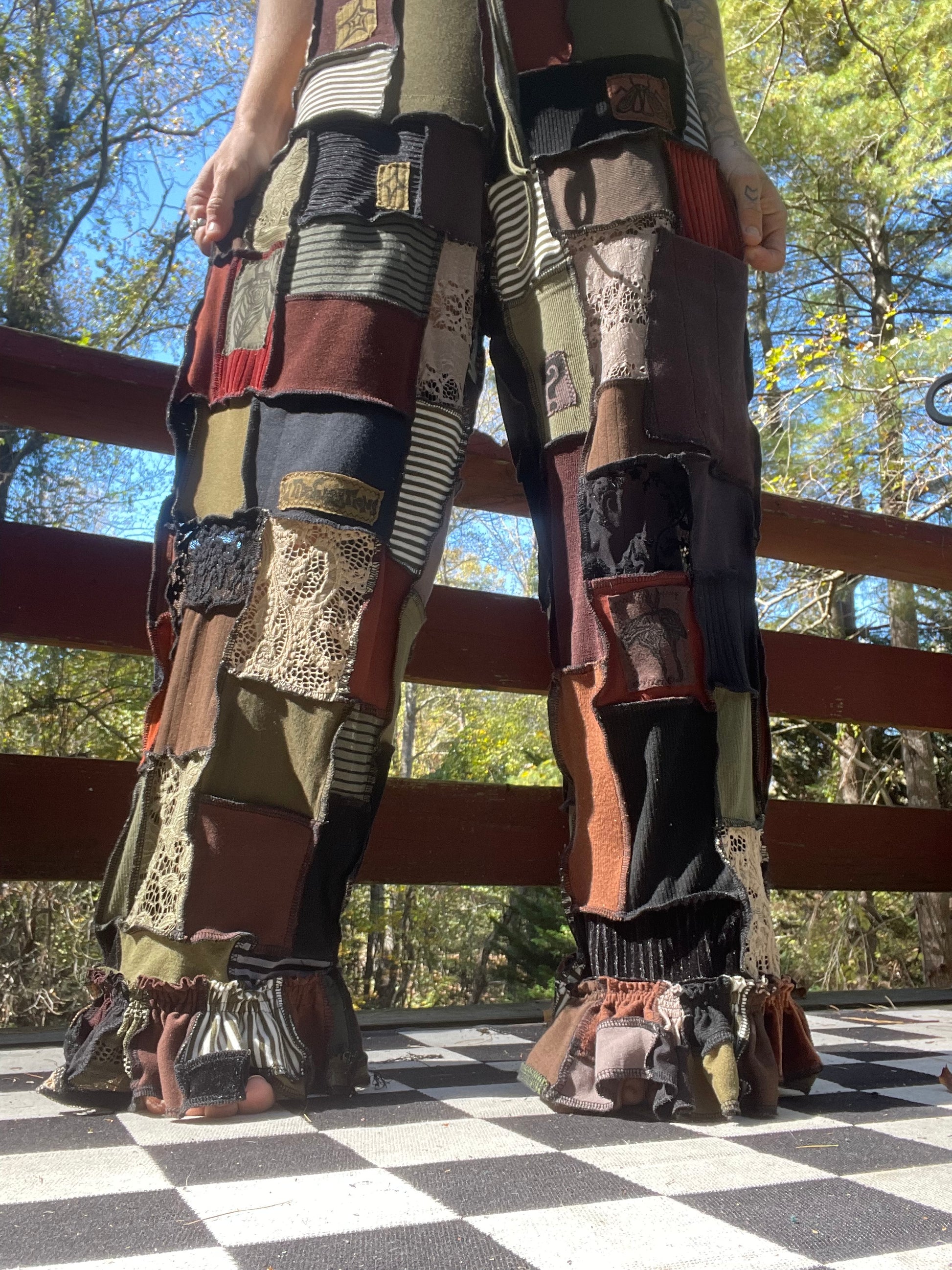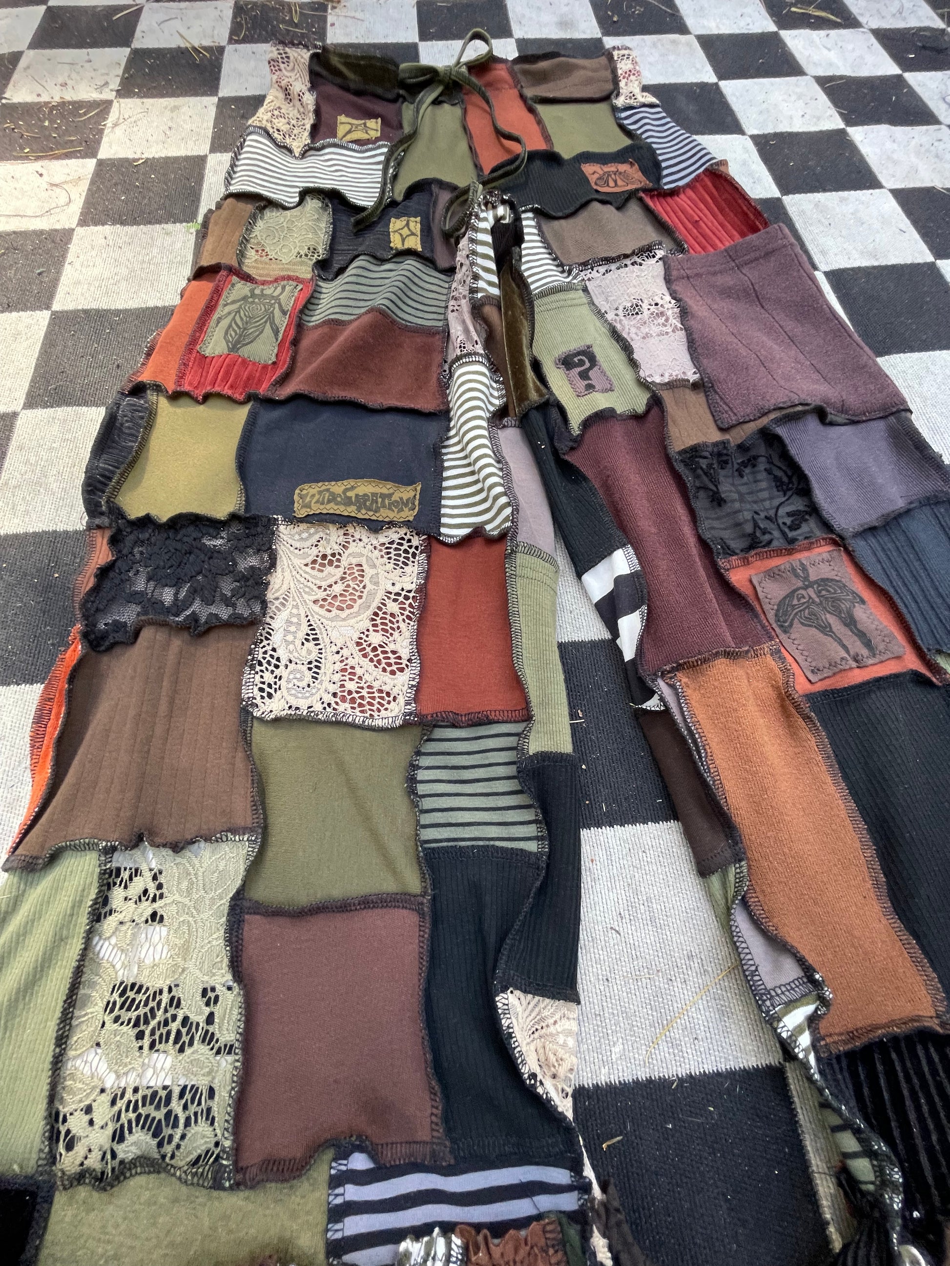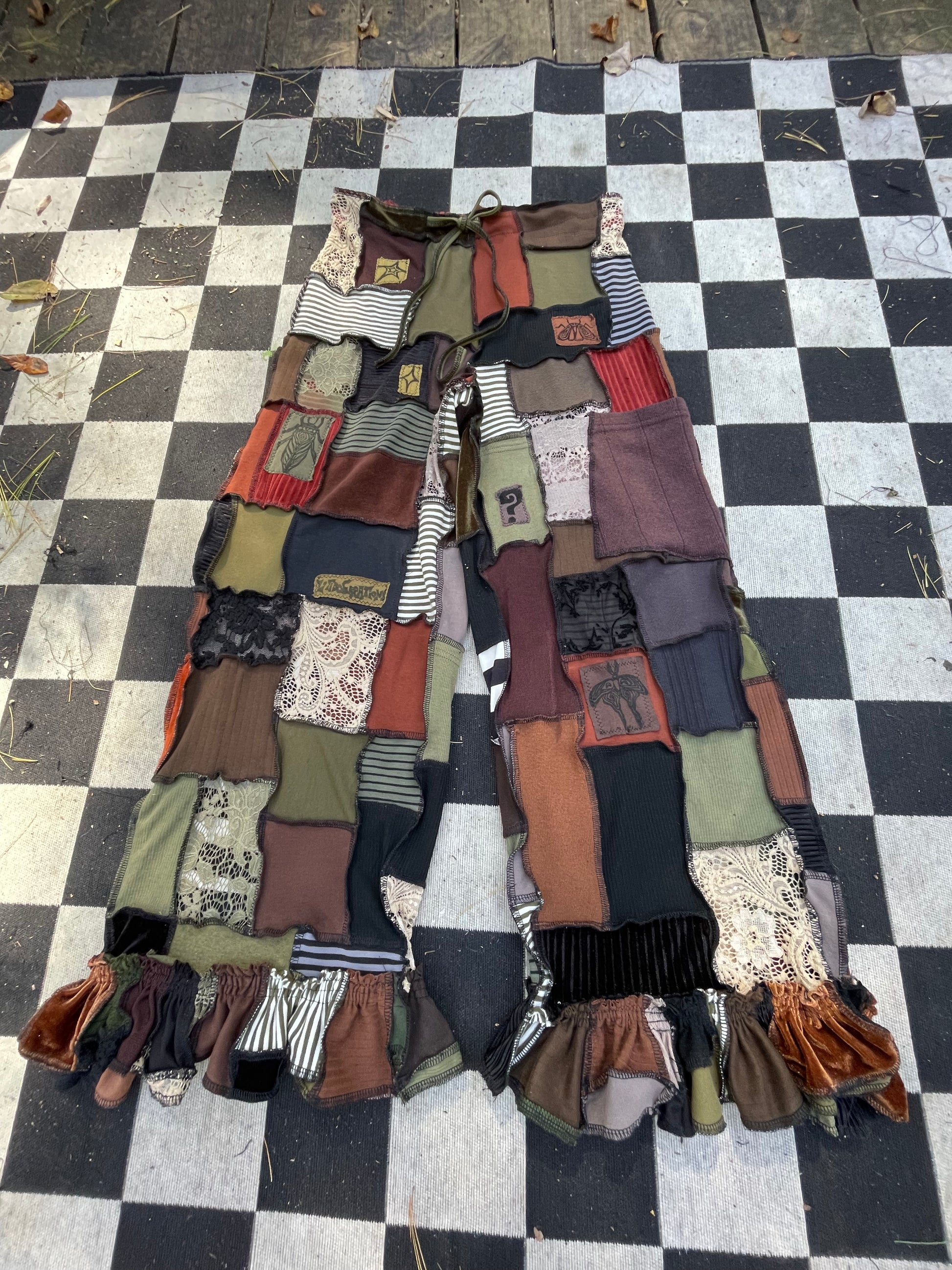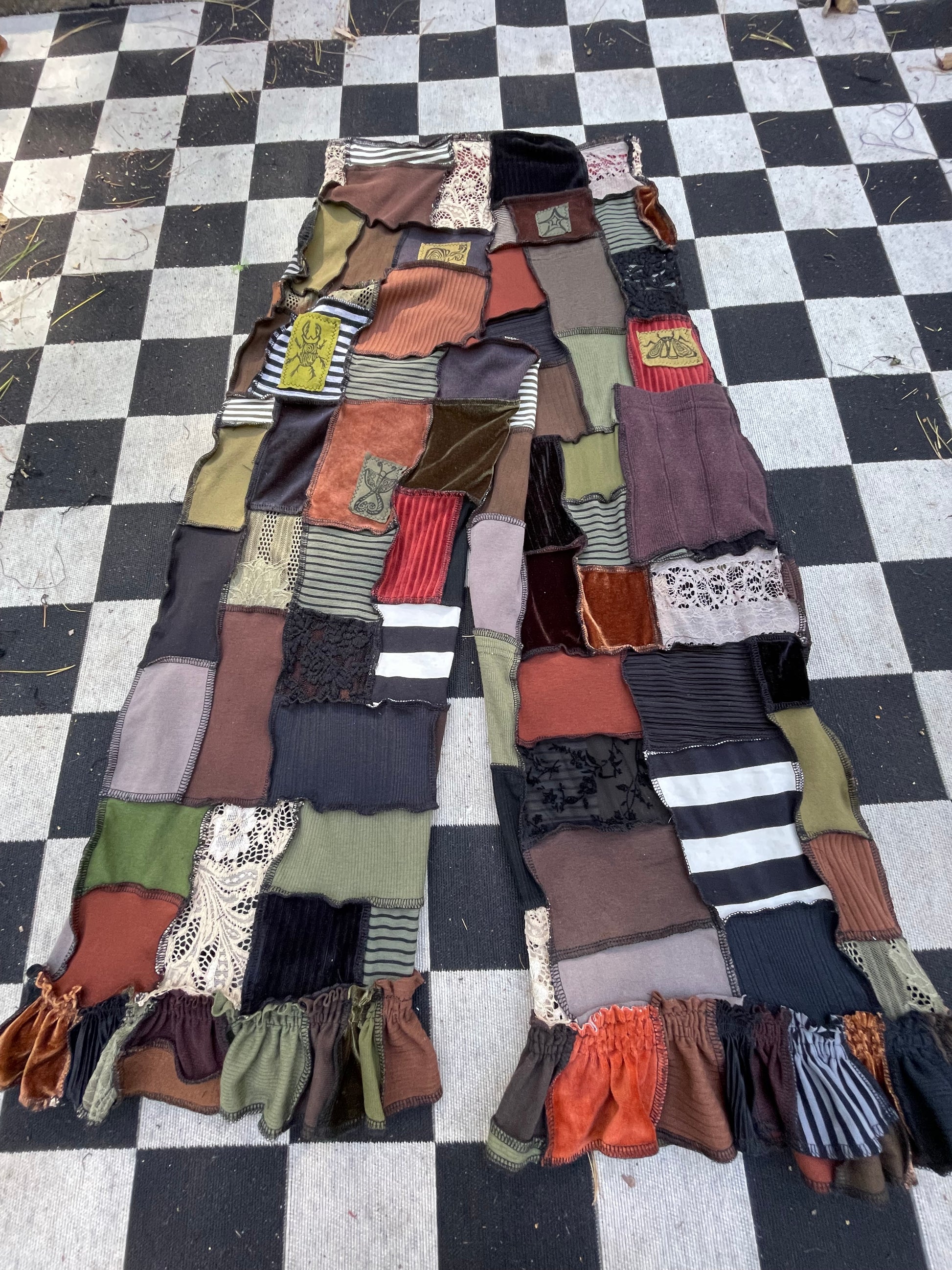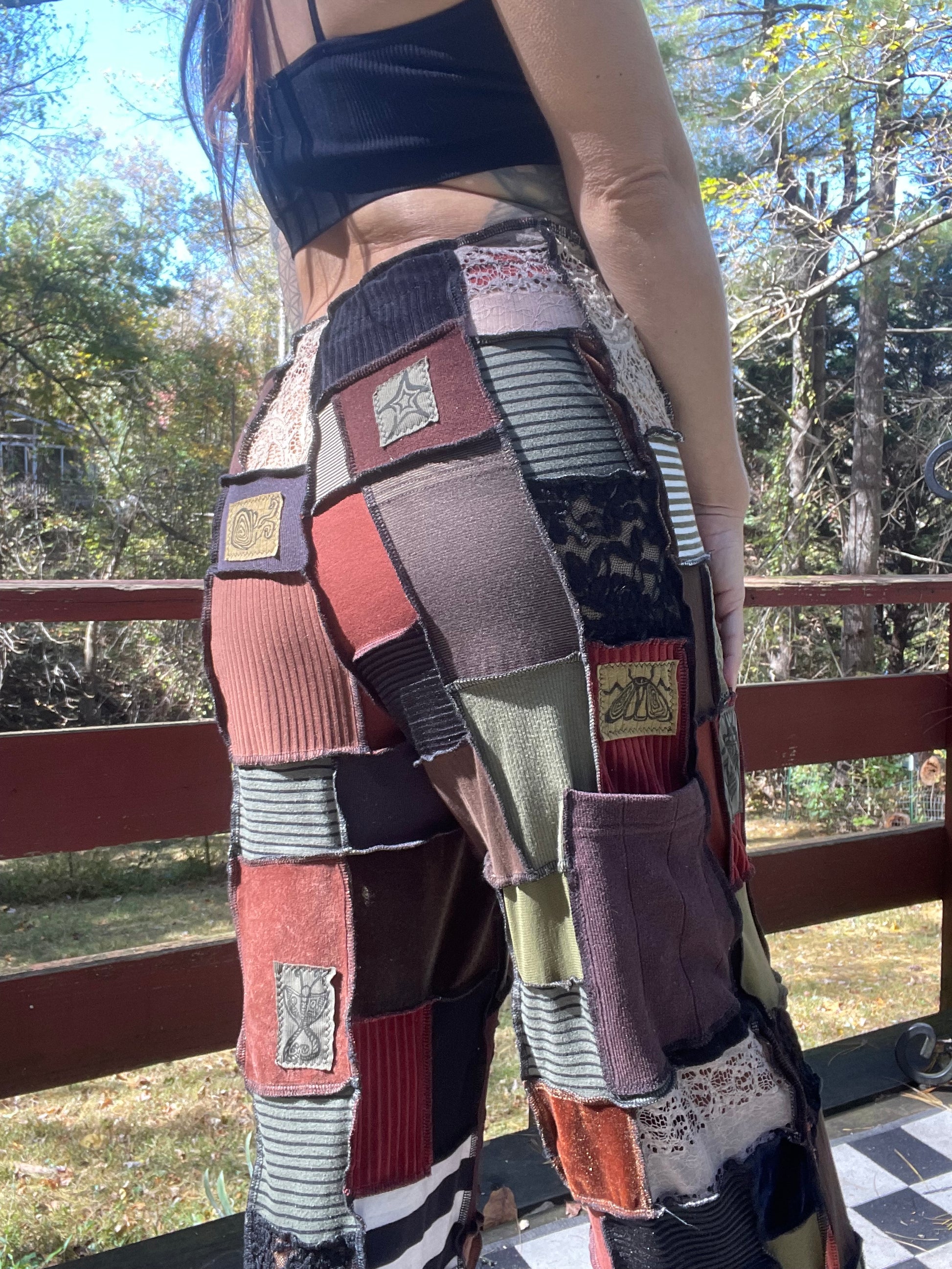 Artsy , elegant micro patchworked pants! Various textiles & shades of the earth & the elements ~ Fits up to XL Message to size down ;; Inseam : 26