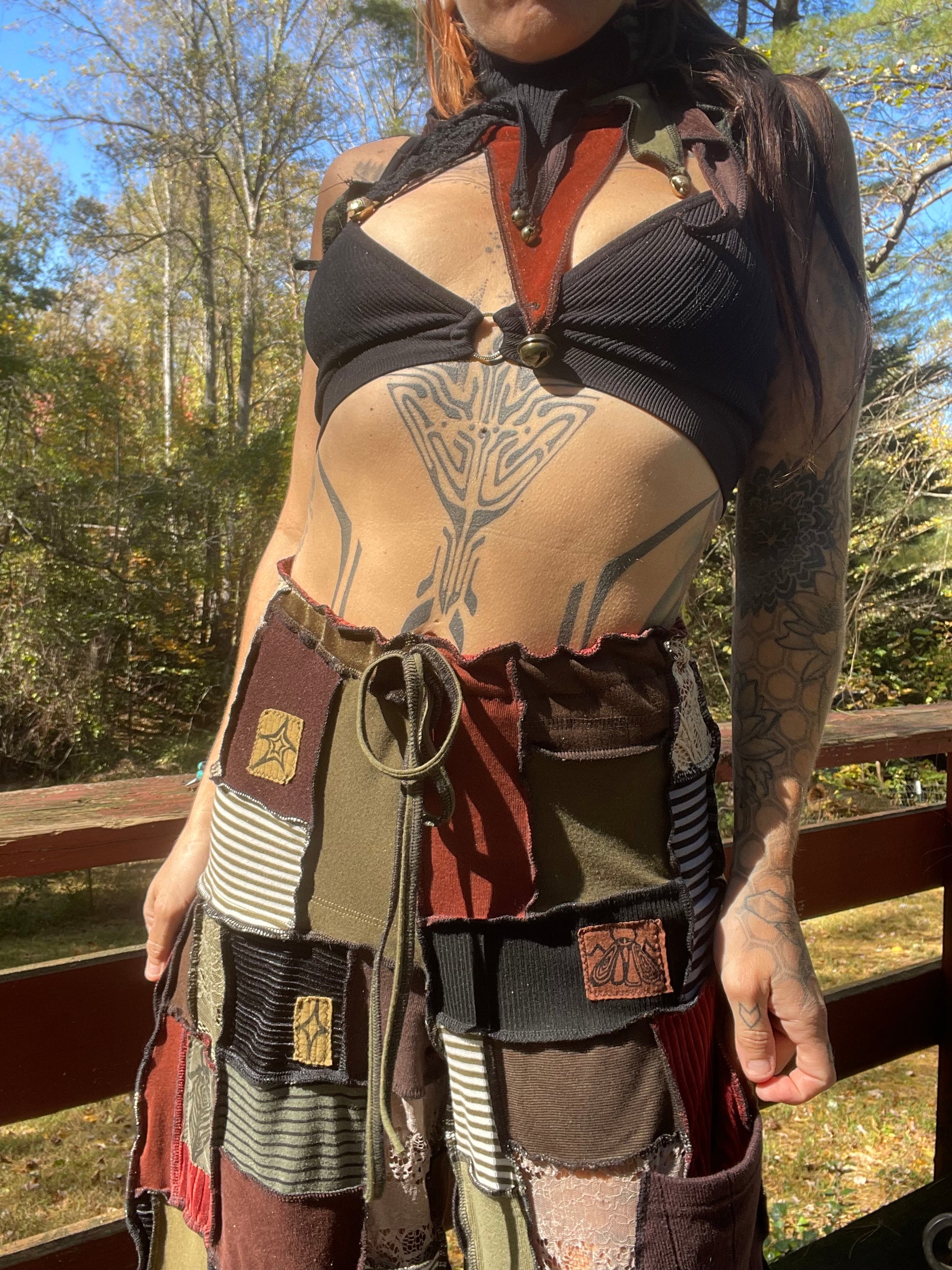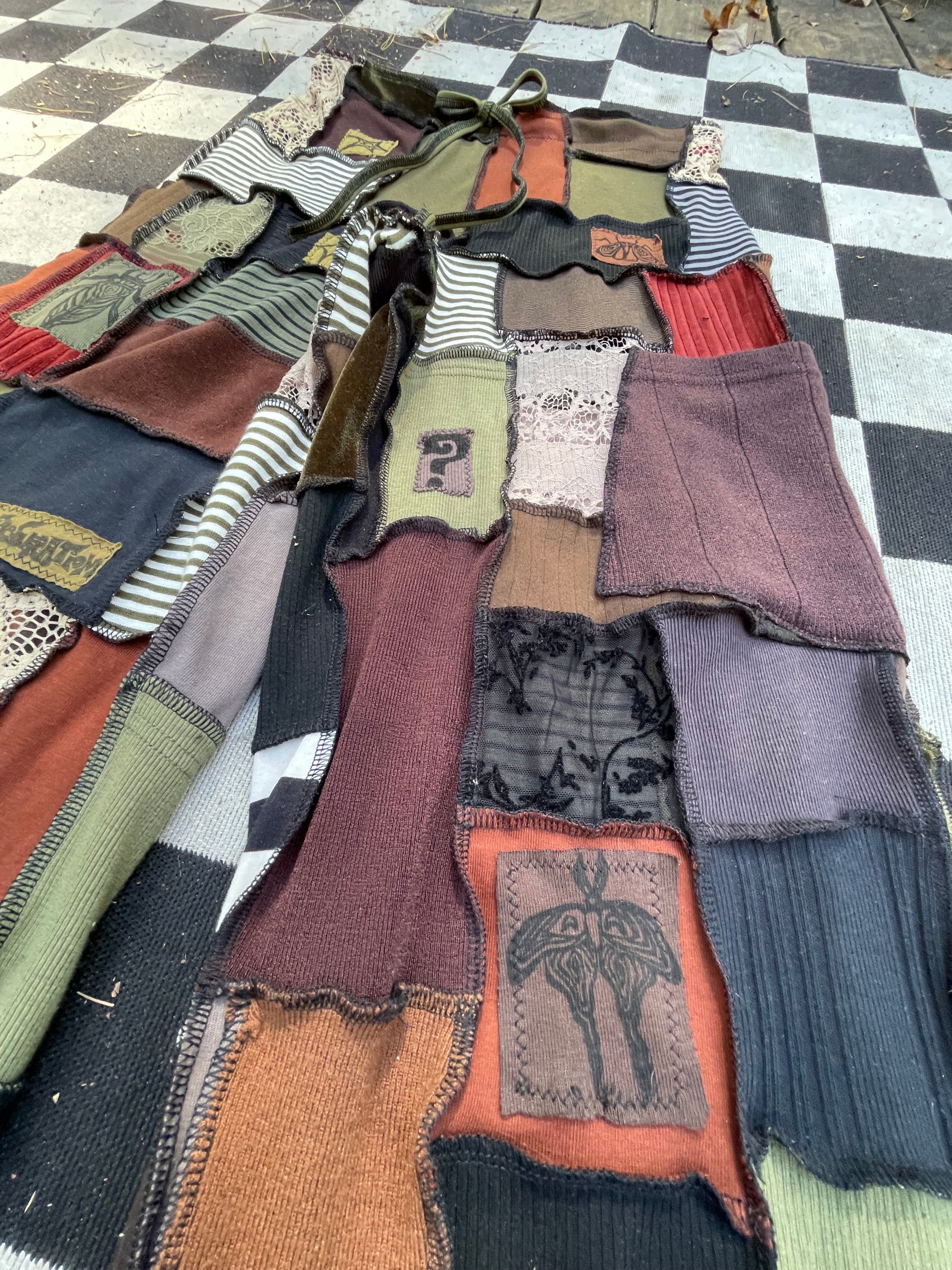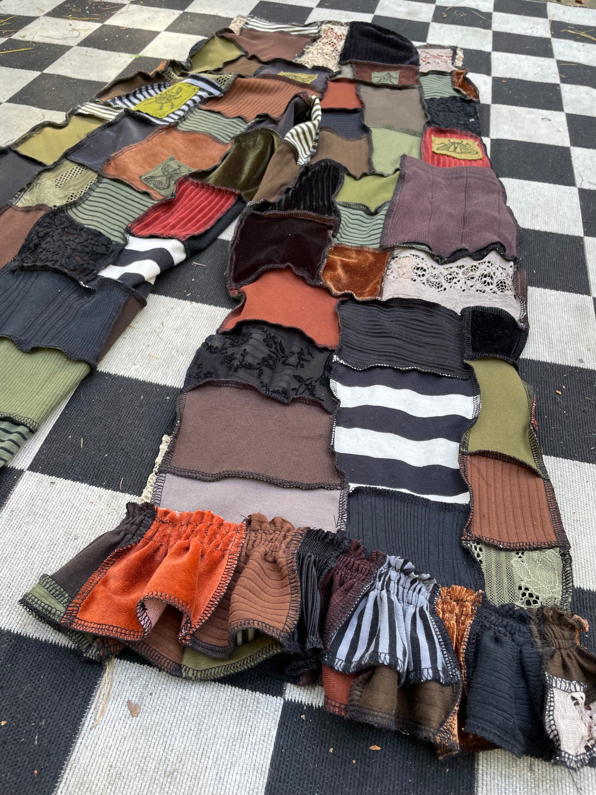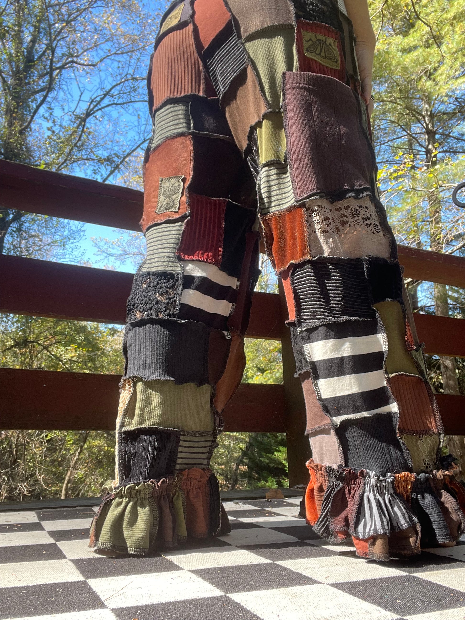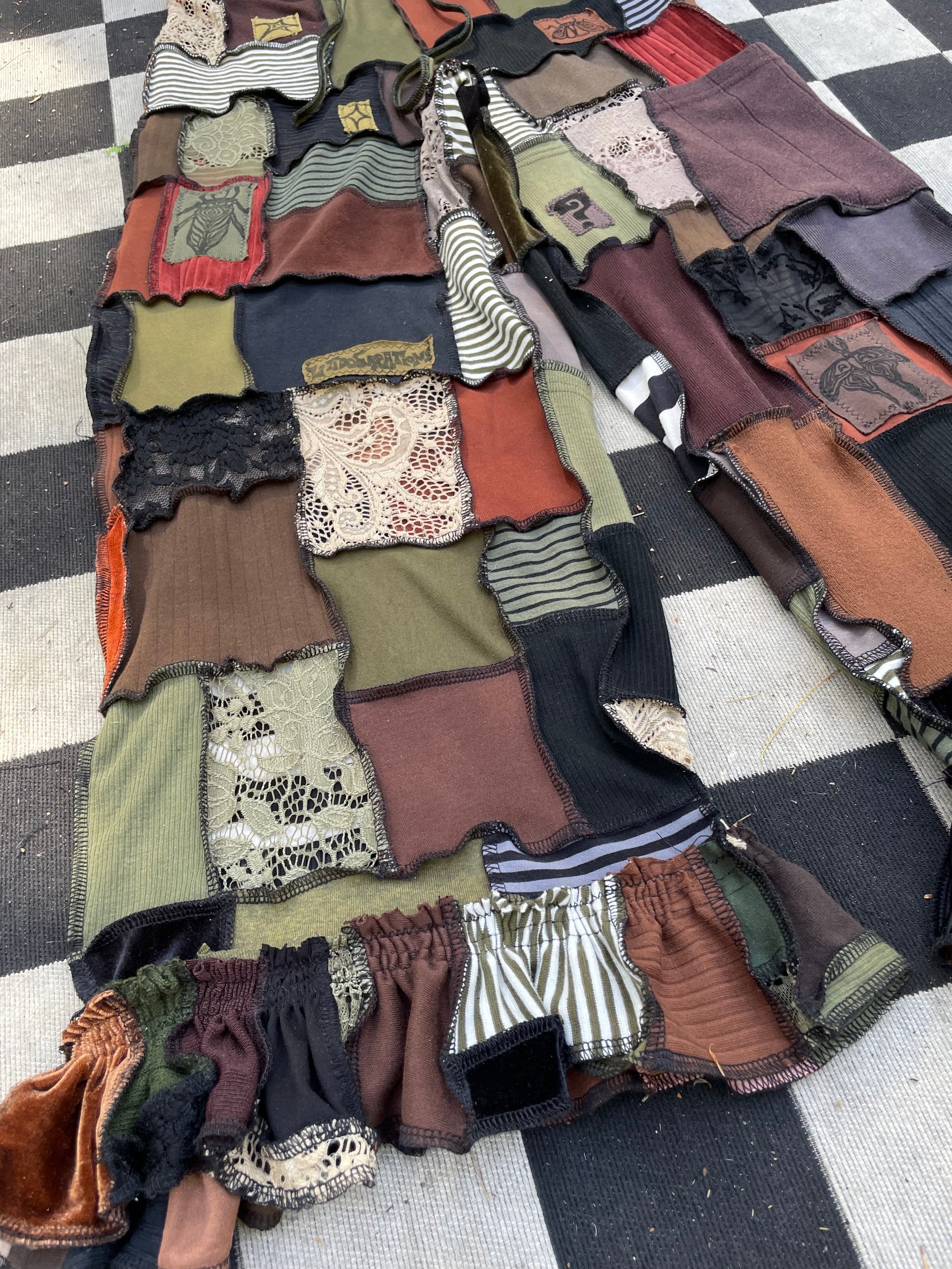 Artsy , elegant micro patchworked pants! Various textiles & shades of the earth & the elements ~ Fits up to XL Message to size down ;; Inseam : 26